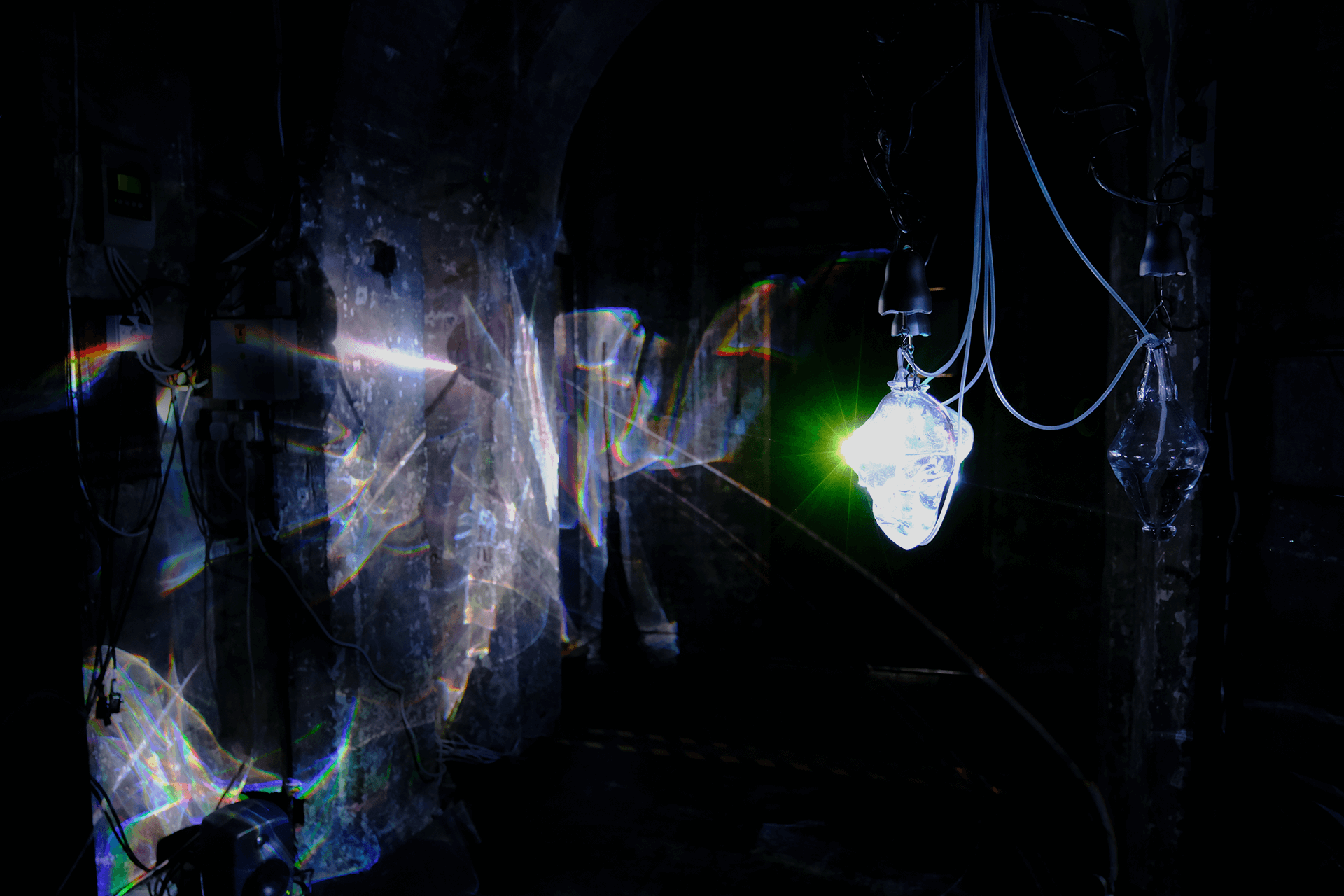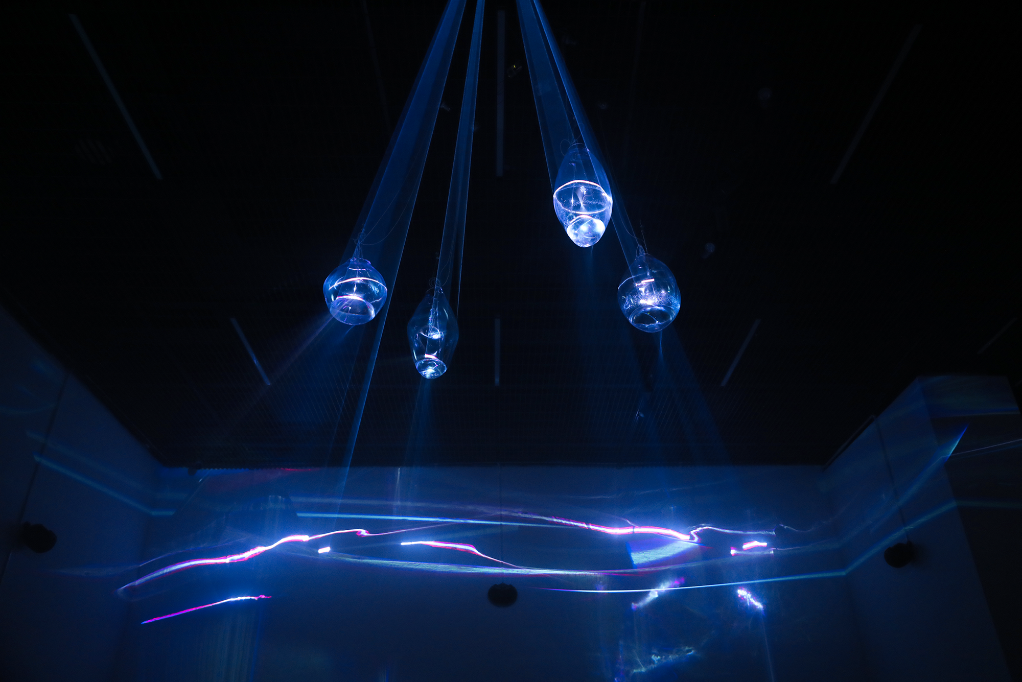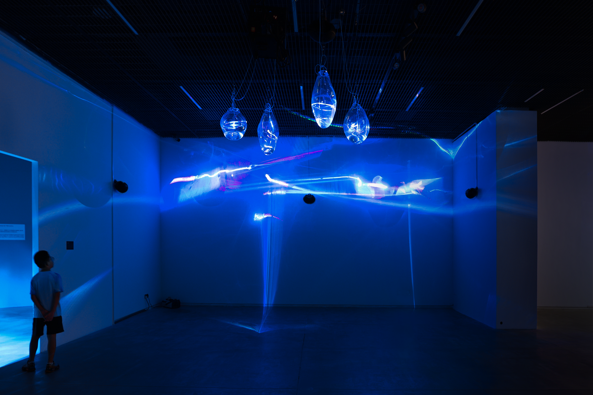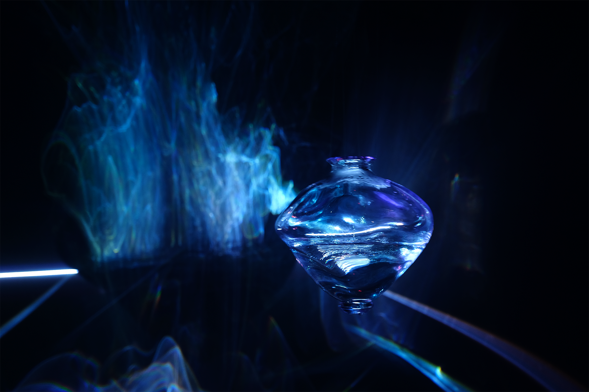The visual installation takes shape in multiple womb-like glass sculptures, constantly modulating the laser projection. Programmed mechanisms create ripples on the water's surface, using refracted lasers to produce different visual patterns. Sound coordinates with programmed projections and lasers to deliver an experimental cross-media narrative. Through immersive nonlinear storytelling, the work guides the audience to explore the relationship between the internal and external, dissolving the boundaries of the self and establishing continuity with the surrounding space.